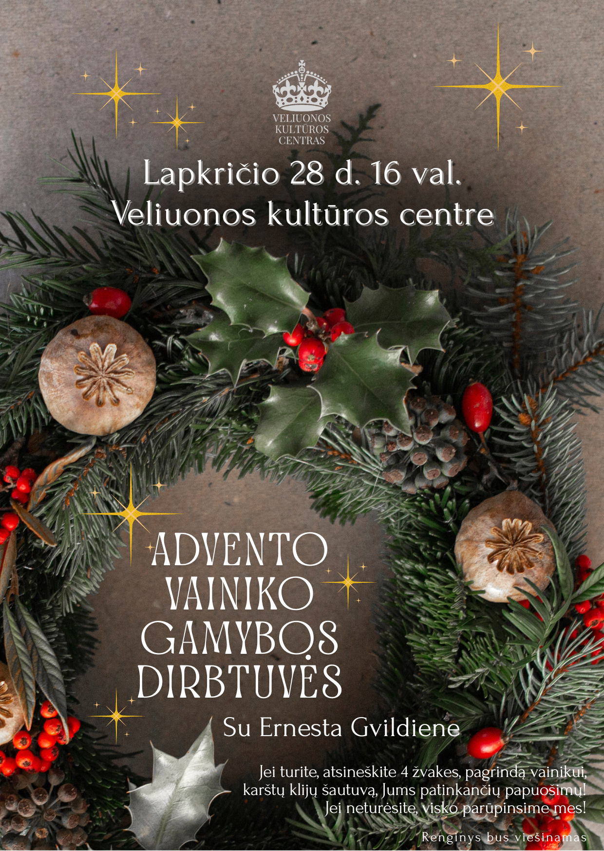 Advento vanikas – tai artėjančių švenčių simbolis. Jis yra apvalus ir simbolizuoja amžinybę bei vienybę, negęstančią saulę, ištikimybę, viltį, tikėjimą. Kartu su Ernesta Gvildiene kursime šiuos simbolius, kurie leis namuose pajausti artėjančią Kalėdų dvasią…