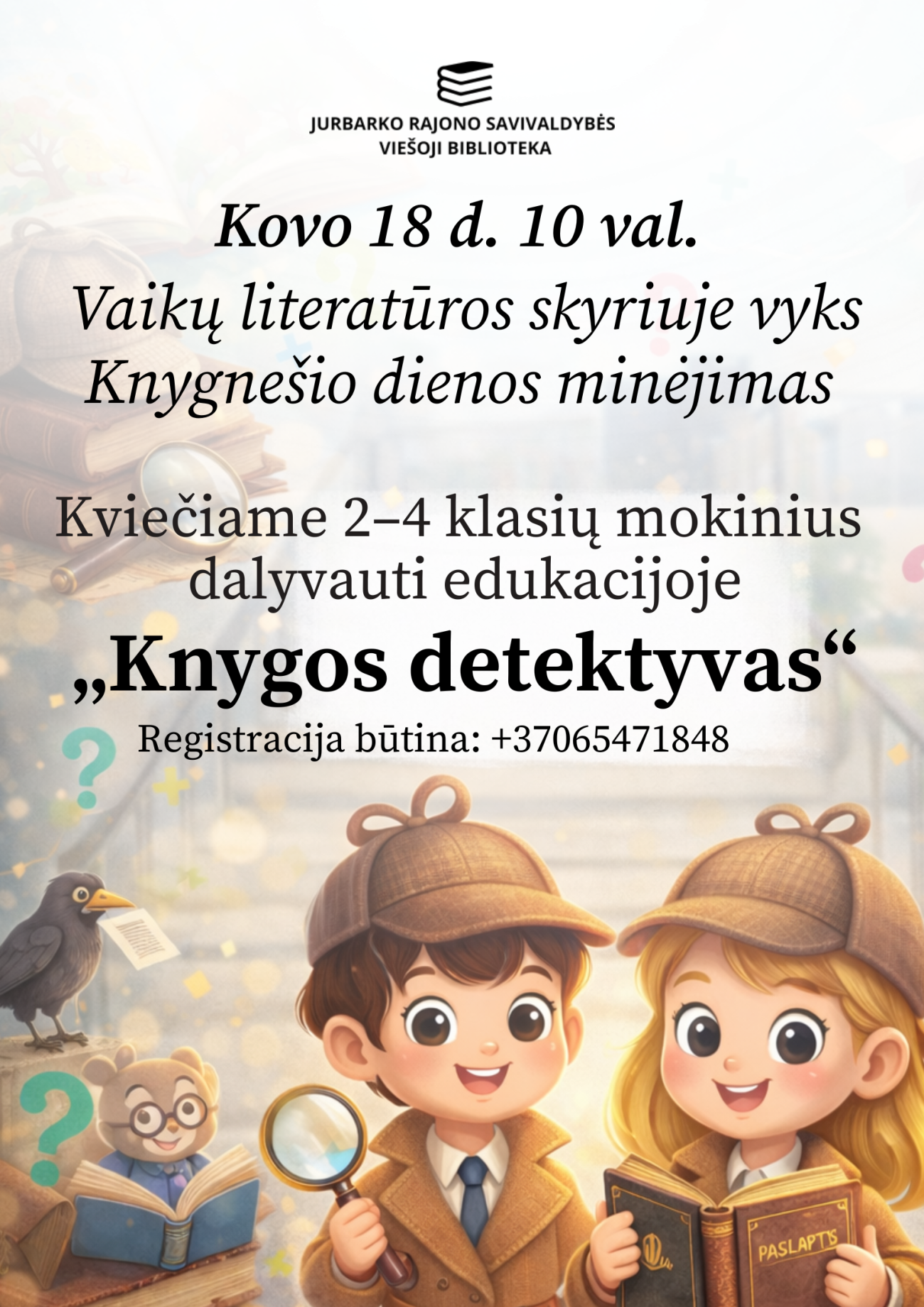 Minint Knygnešio dieną Vaikų literatūros skyriuje vyks edukacinė veikla „Knygos detektyvas“, skirta 2–4 klasių mokiniams. Užsiėmimo metu vaikai susipažins su knygų draudimo laikotarpiu, sužinos apie knygnešių veiklą ir knygos reikšmę Lietuvos istorijoje. Dalyviai taps „knygos detektyvais“ – spręs logines, pastabumą ir mąstymą lavinančias užduotis, ieškos paslėptų užuominų, keliaus simboliniu knygų labirintu ir savarankiškai atras svarbius istorinius faktus. Veikla skatina kritinį mąstymą, aktyvų pažinimą, domėjimąsi Lietuvos istorija bei pagarbą knygai kaip žinių ir laisvės simboliui.