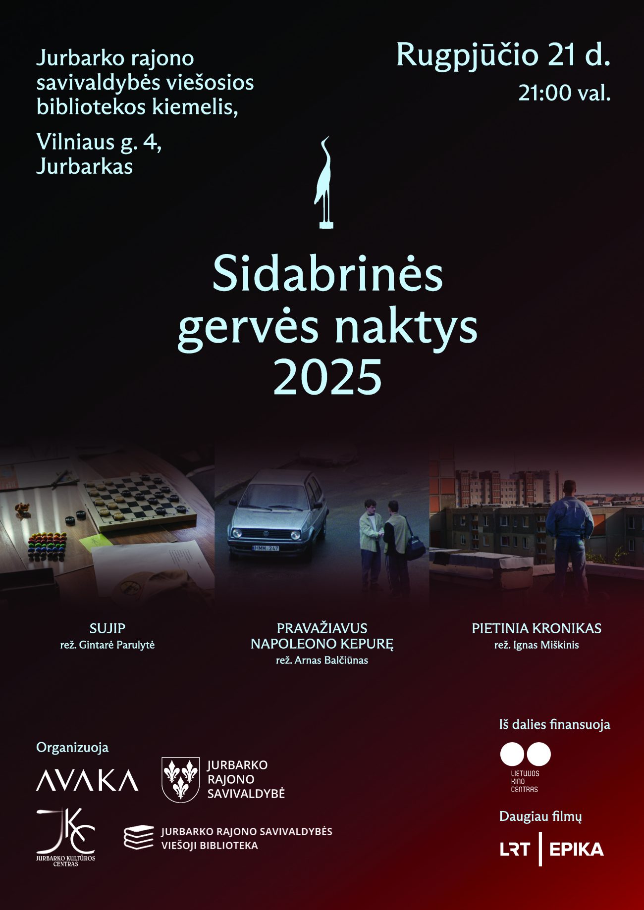 Vasaros kino festivalis „Sidabrinės gervės naktys“ keliauja per Lietuvą su nacionalinių kino apdovanojimų „Sidabrinė gervė 2025“ filmais nominantais ir laureatais. Programoje rodomi filmai, apimantys ilgametražių, trumpametražių bei studento darbų kategorijų filmus.