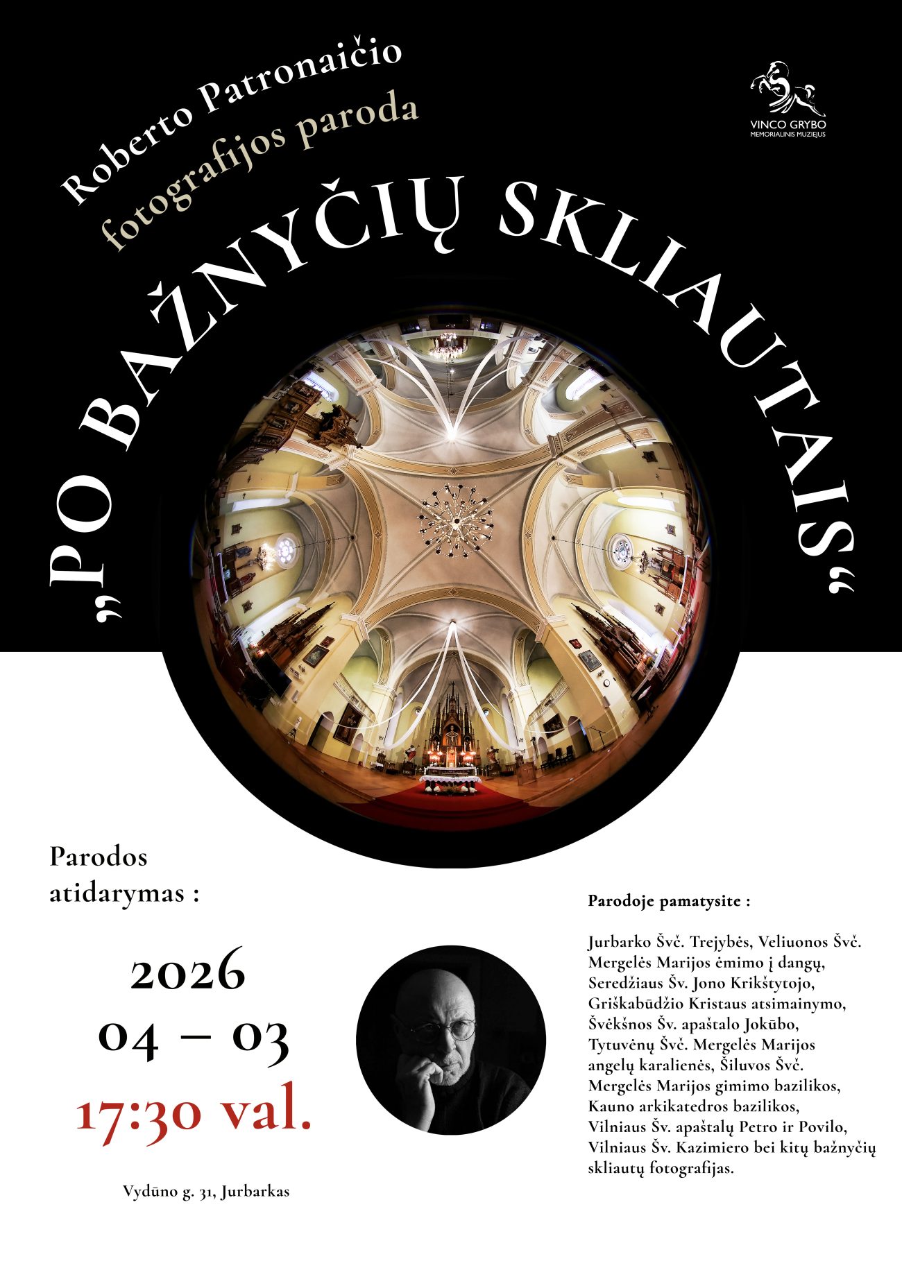 Taip apie naujo fotografijų ciklo parodos „Po bažnyčios skliautais” atsiradimą pasakoja fotografas Robertas Patronaitis. Jis, naudojo „keistą, super plačiakampį objektyvą „žuvies akį” ir nufotografavo daugybę Jurbarko rajono ir kitų Lietuvos bažnyčių. „Žuvies akies“ efektas fotografuojant išgaubtas arcitektūros formas, pabrėžia erdvės ir aukščio pojūtį, kompozicijoje matomas vaizdas, tarsi apvalios planetos yra be galo įspūdingas ir dinamiškas. Atrinkęs pačius įspūdingiausius vaizdus, Robertas Patronaitis parengė parodą, kuri bus pristatyta Didįjį penktadienį, balandžio 3 dieną, 17,30 val. Vinco Grybo memorialiniame muziejuje.