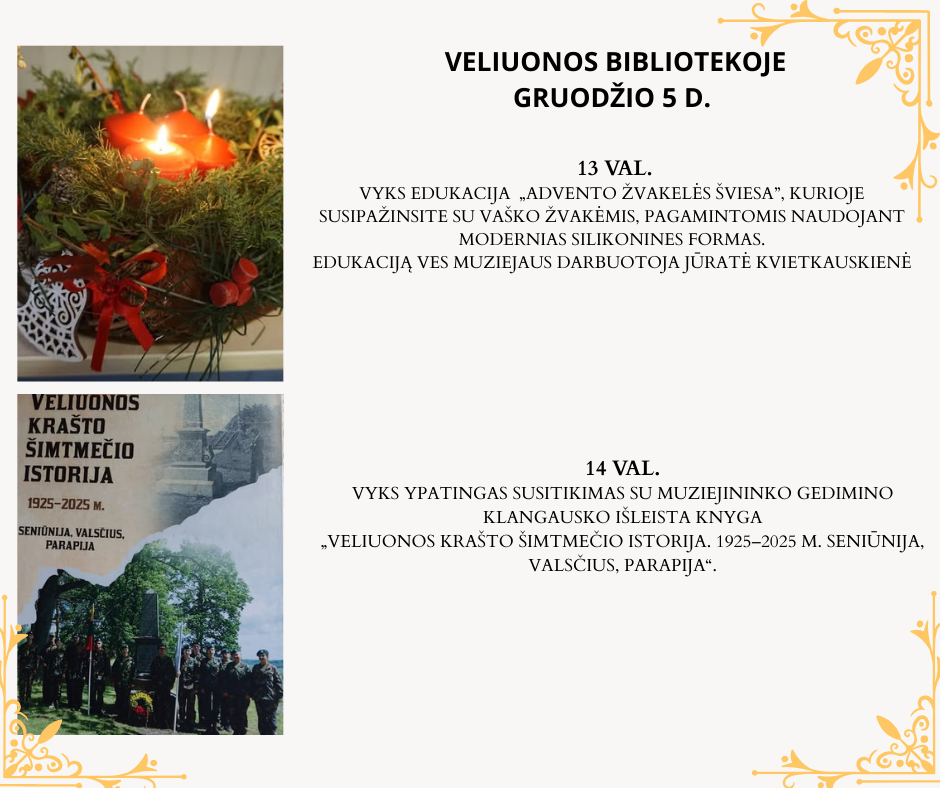 Gruodžio 5 dieną Veliuonos bibliotekoje vyks ypatingas susitikimas su krašto istorija – muziejininko Gedimino Klangausko išleistos knygos „Veliuonos krašto šimtmečio istorija. 1925–2025 m. Seniūnija, valsčius, parapija“ pristatymas.