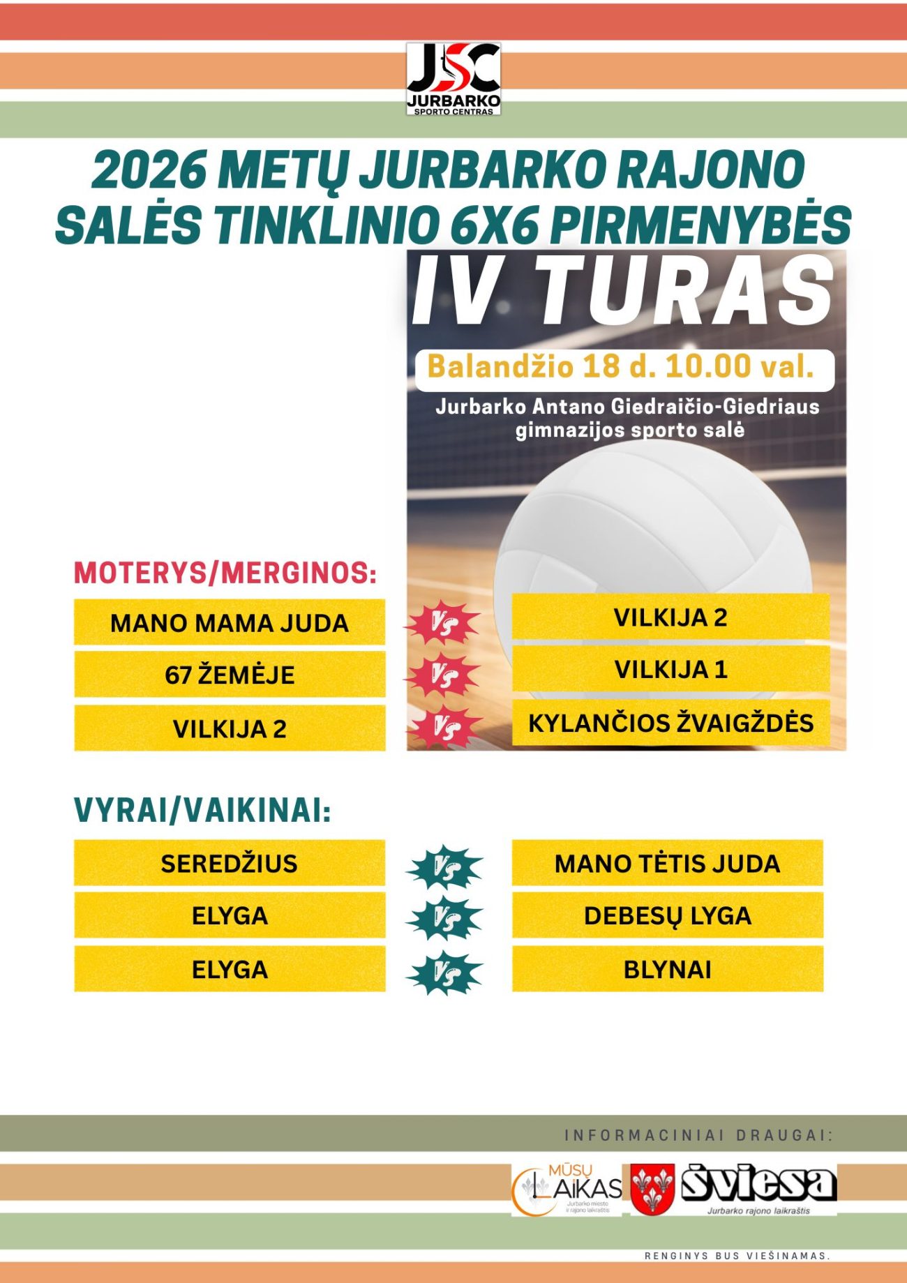 Kviečiame į varžybas – 2026 metų Jurbarko rajono salės tinklinio 6×6 pirmenybių IV turą.