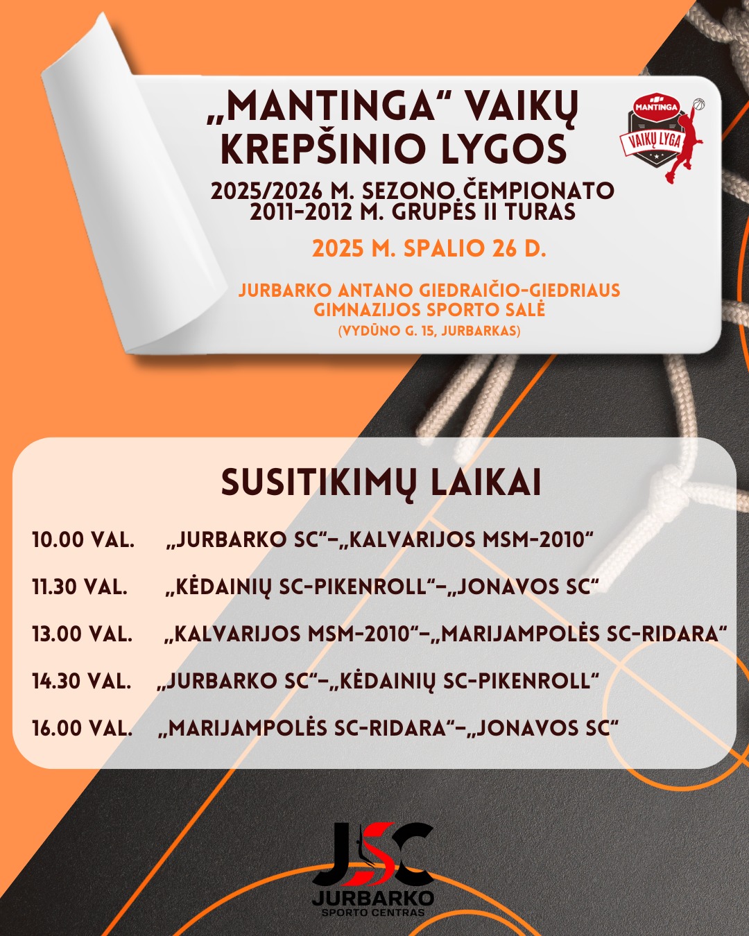 Spalio 26-ąją į Jurbarko Antano Giedraičio-Giedriaus gimnazijos sporto salę sugrįžta „Mantinga“ vaikų krepšinio lyga su nauju sezonu! Čia vyks gimusiųjų 2011–2012 m. grupės II turas.