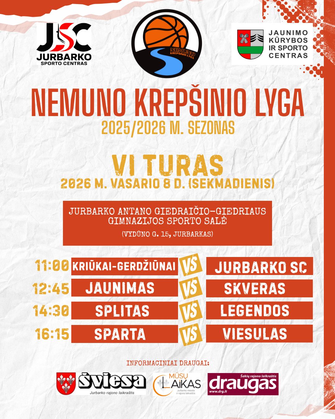 Kviečiame krepšinio sirgalius į Nemuno krepšinio lygos 2025/2026 m. sezono VI turą, kuris vyks 2026 m. vasario 8 d. Jurbarko Antano Giedraičio-Giedriaus gimnazijos sporto salėje (Vydūno g. 15, Jurbarkas).