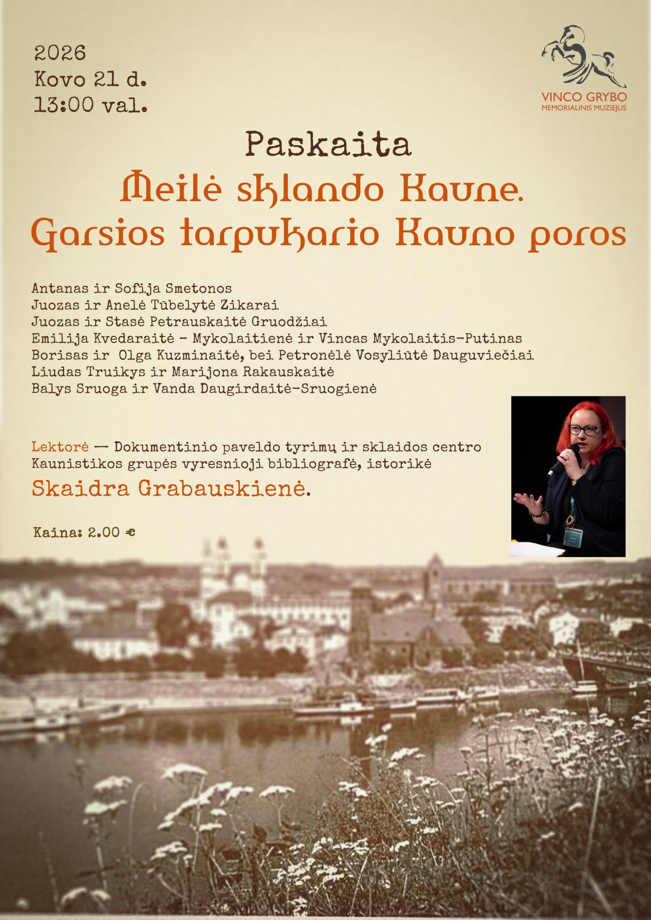 Vinco Grybo memorialinis muziejus kviečia į paskaitą, kurioje išgirsite septynis pasakojimus apie garsių Kauno tarpukario porų gyvenimą. Istorijos atkurtos tyrinėjant laiškus, dienoraščius, dokumentus, atsiminimus.