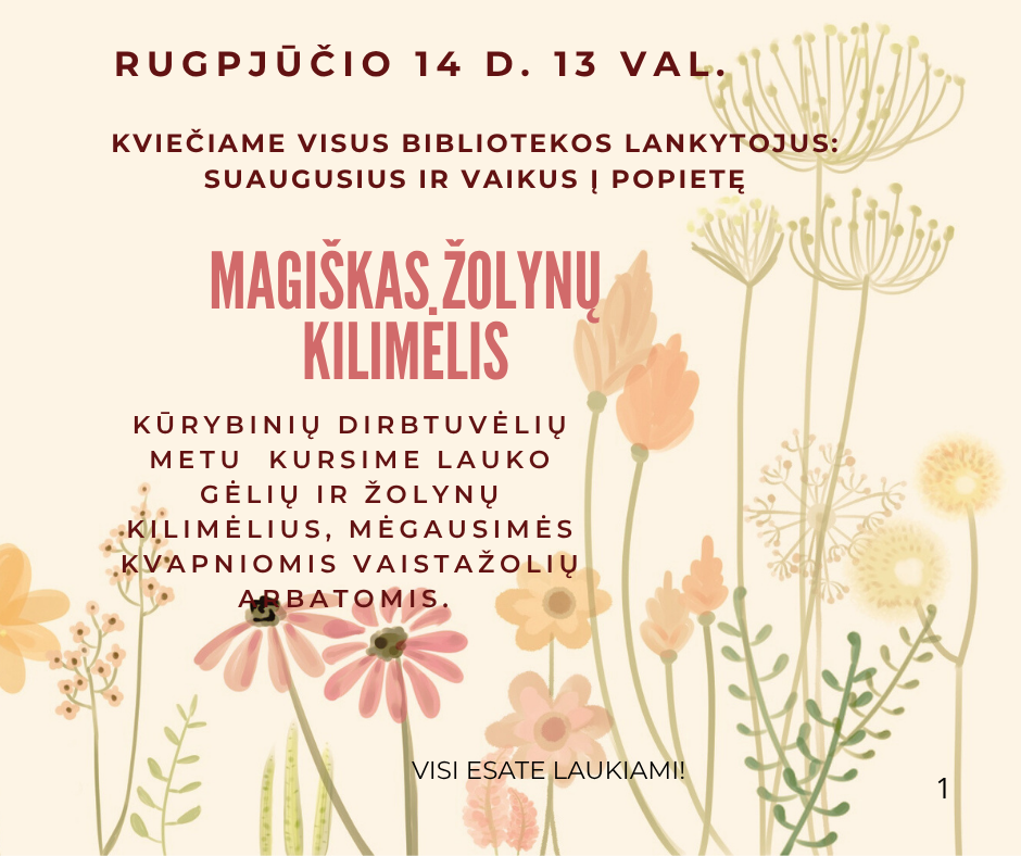 Kviečiame visus bibliotekos lankytojus – suaugusius ir vaikus – į jaukią vasaros popietę „Magiškas žolynų kilimėlis“ Armeniškių bibliotekoje. Jos metu susipažinsime su lietuvių liaudies tradicijomis, kurios susijusios su Žolinių švente. Kūrybinių dirbtuvėlių metu turėsite galimybę susikurti lauko gėlių ir žolynų kilimėlius, pasimėgauti kvapniomis vaistažolių arbatomis.