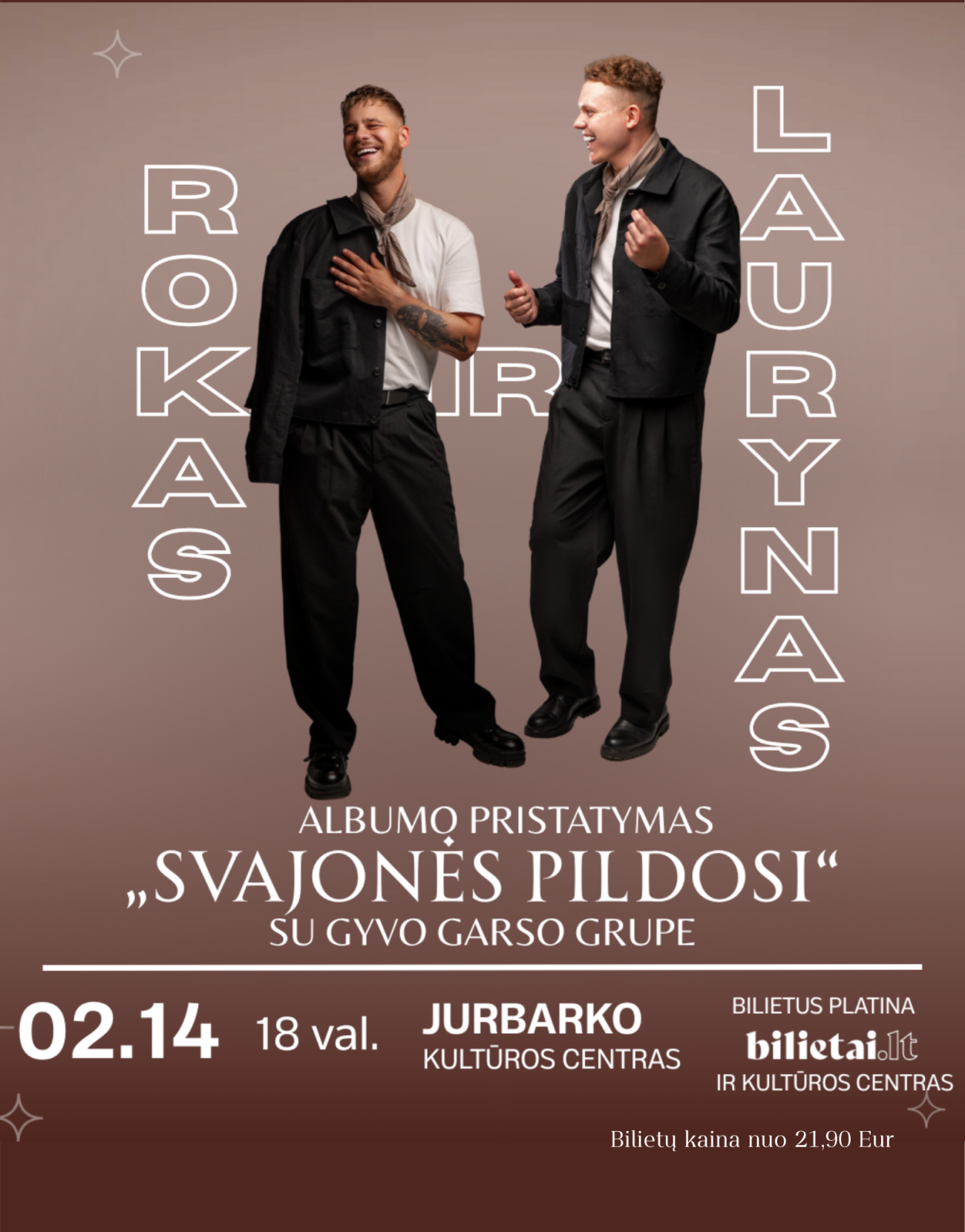 Savo ištikimą gerbėjų būrį Lietuvoje turintys atlikėjai „Rokas ir Laurynas“ kviečia į savo pirmojo albumo pristatymą „Svajonės pildosi“ su gyvo garso grupe Jurbarko kultūros centre!
