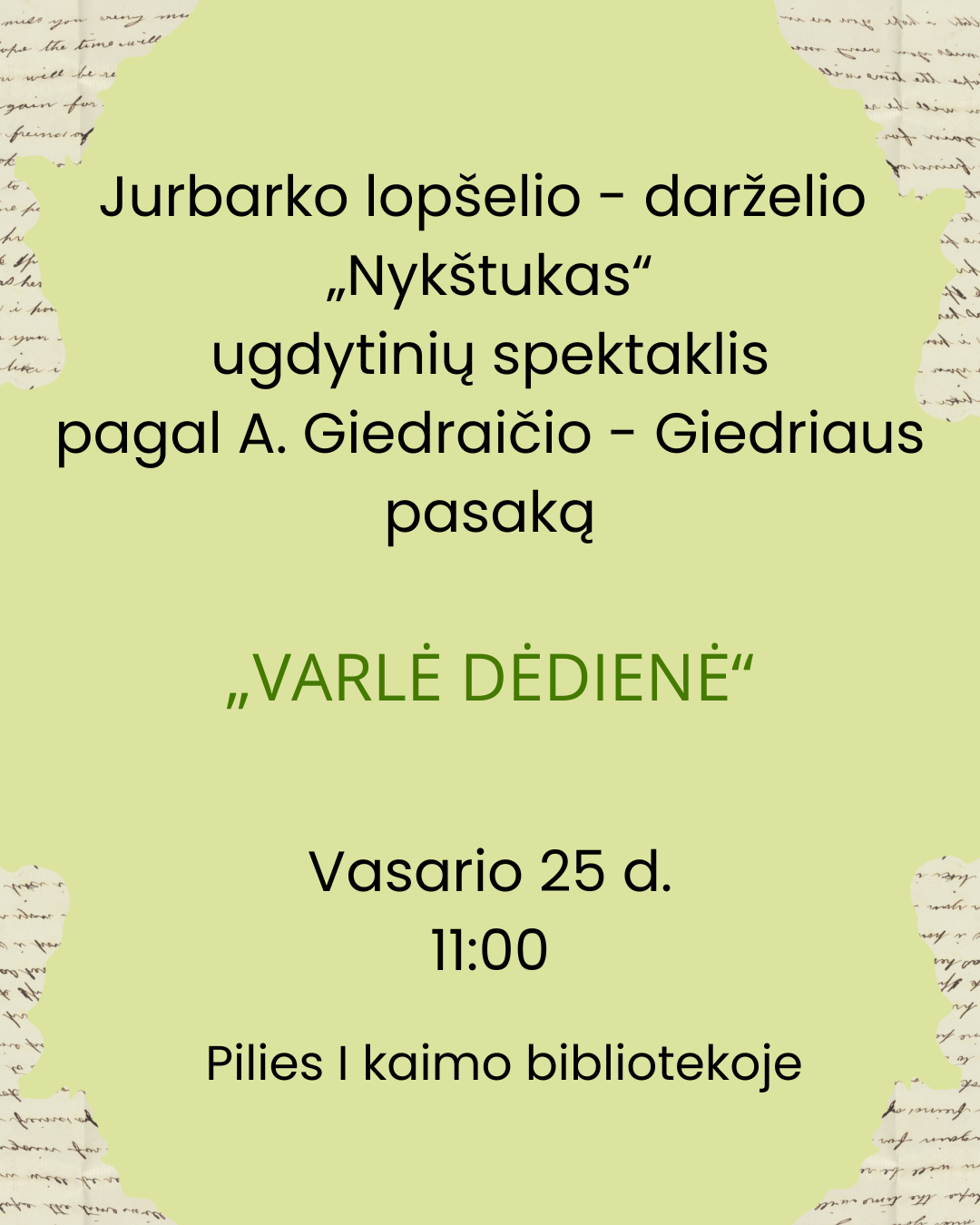 Jurbarko lopšelio – darželio „Nykštukas“ „Sveikuolių“ grupės vaikai ir mokytojos kviečia į spektaklį, sukurtą pagal Antano Giedraičio-Giedriaus pasaką „Varlė dėdienė“. Spektaklis bus rodomas Pilies I bibliotekoje.