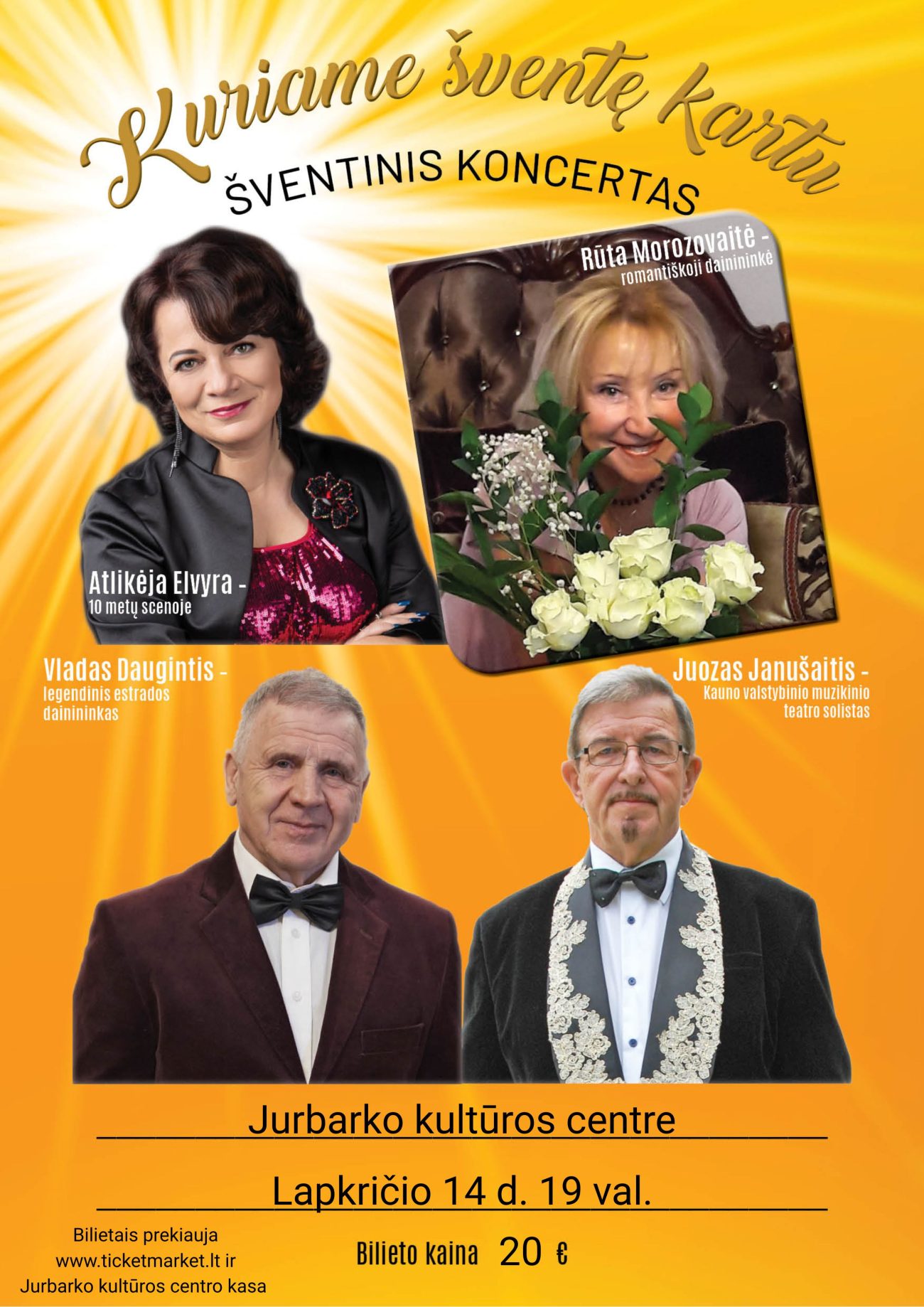 Bilietus galite įsigyti www.ticketmarket.lt ir Jurbarko kultūros centro bilietų kasoje (darbo dienomis nuo 16 iki 18 val.), tel. +370 698 70 372