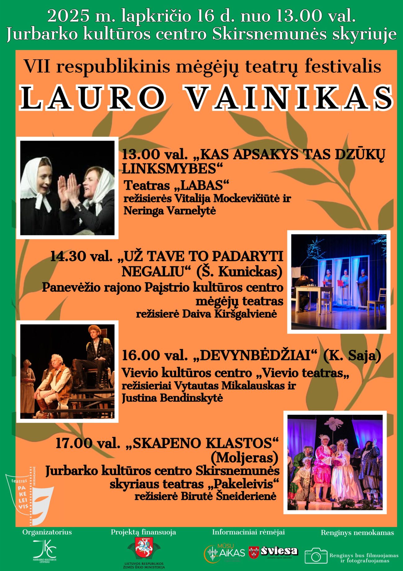 14.30 val. „UŽ TAVE TO PADARYTI NEGALIU“ (Š. Kunickas) – Panevėžio rajono Paįstrio kultūros centro mėgėjų teatras režisierė Daiva Kiršgalvienė
